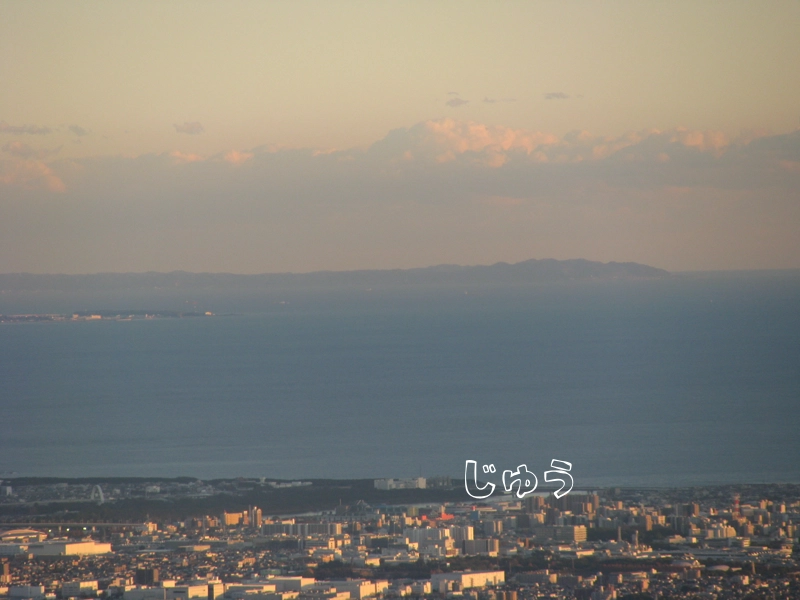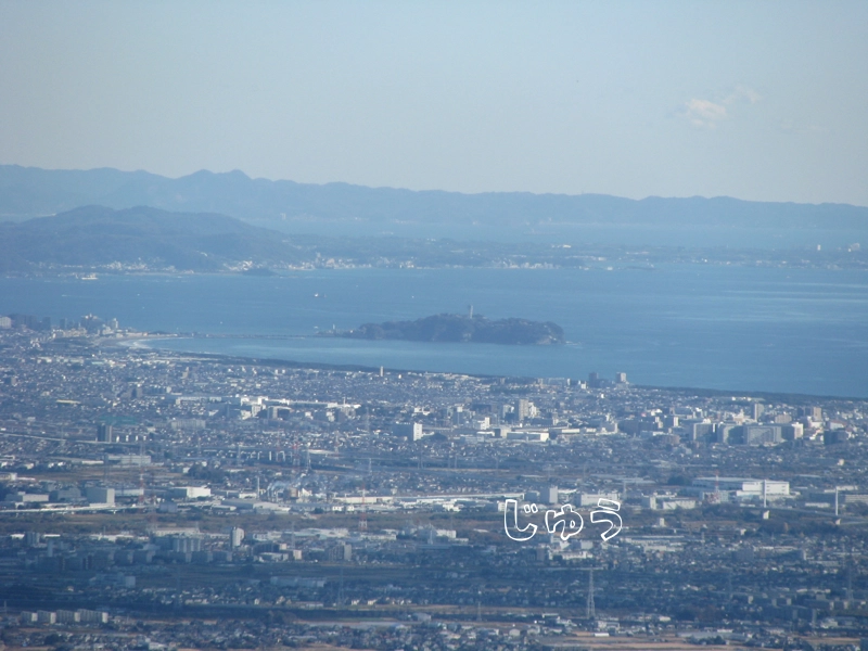 江の島とその先に三浦半島、さらに先に房総半島が見えます。