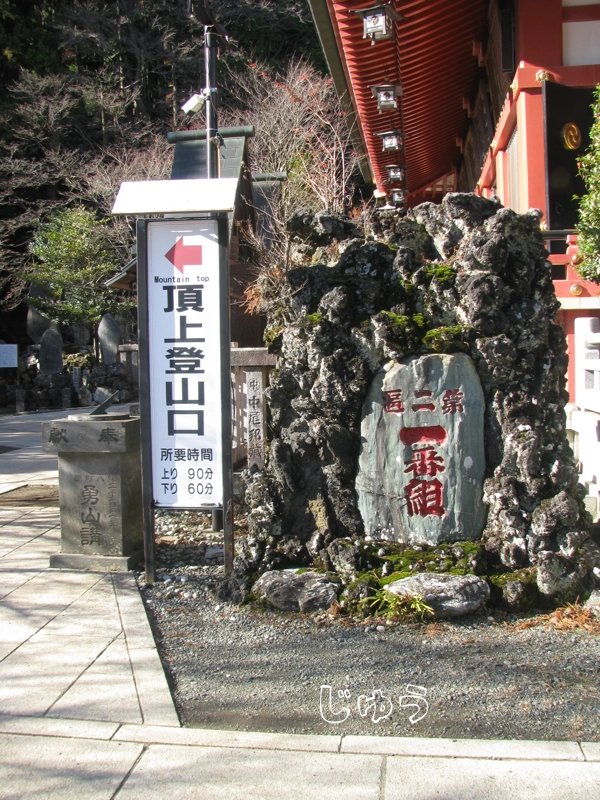 🅿⇐駅:30分、駅⇐女坂⇐下社:30分、下社⇐山頂:60分、計:120分 - 駐車場からケーブルカー駅まで歩き、ケーブルカーで下社まで、下社から山頂まで往復歩く
